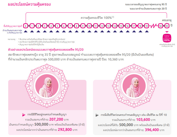 - มั่นใจได้ว่าครอบครัวจะสามารถมีเงินทุนเพียงพอหากเกิดเหตุการณ์ที่มีผลกระทบต่อรายได้หรือความเป็นอยู่ของบุคคลในครอบครัว โดยชำระเงินสมทบตะกาฟุล 20 ปีแต่ให้ความคุ้มครองชีวิต จนครบอายุ 95 ปี