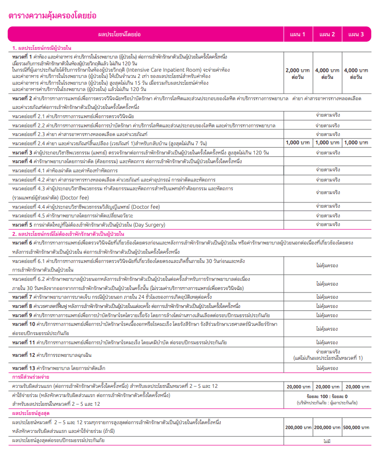 - ช่วยเติมเต็มค่ารักษาพยาบาลที่เกินกว่าสวัสดิการค่ารักษาพยาบาลที่มีอยู่ ไม่ซ้ำซ้อนกับความคุ้มครองเดิมที่มีอยู่
