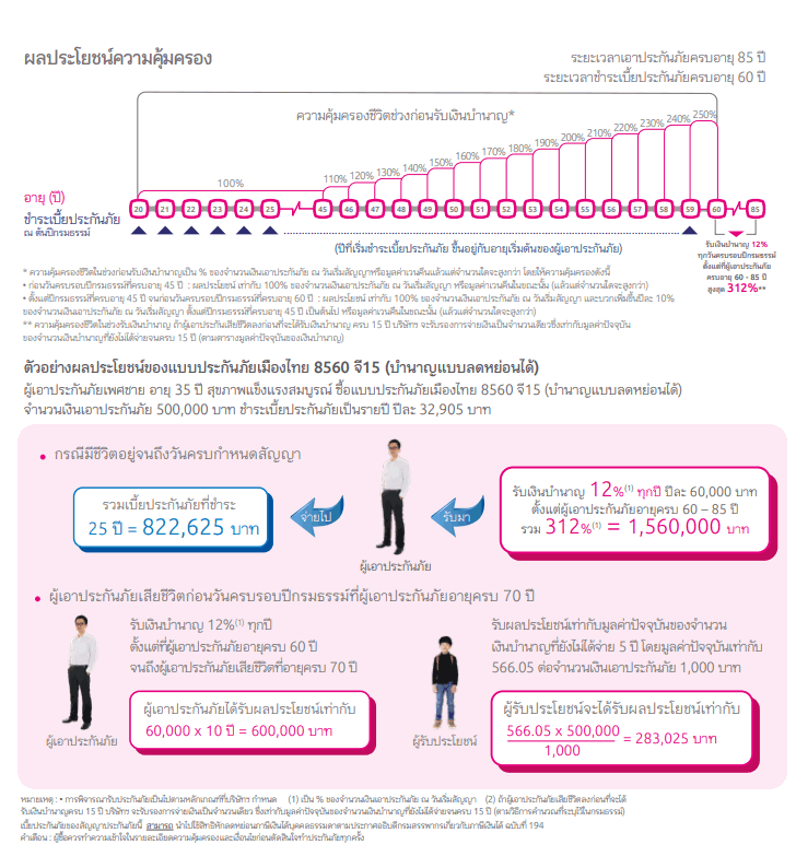 เมืองไทย 8560 จี15(บำนาญลดหย่อนได้) ชำระเบี้ยครบอายุ 60 ปี ได้เงินคืนปีละ 12 % ทุกปีตั้งแต่สิ้นปีกรมธรรม์ที่ครบอายุ 60 ปี จนถึงอายุ 85 ปี ลดหย่อนภาษีได้สูงสุด 200,000 บาทต่อปี