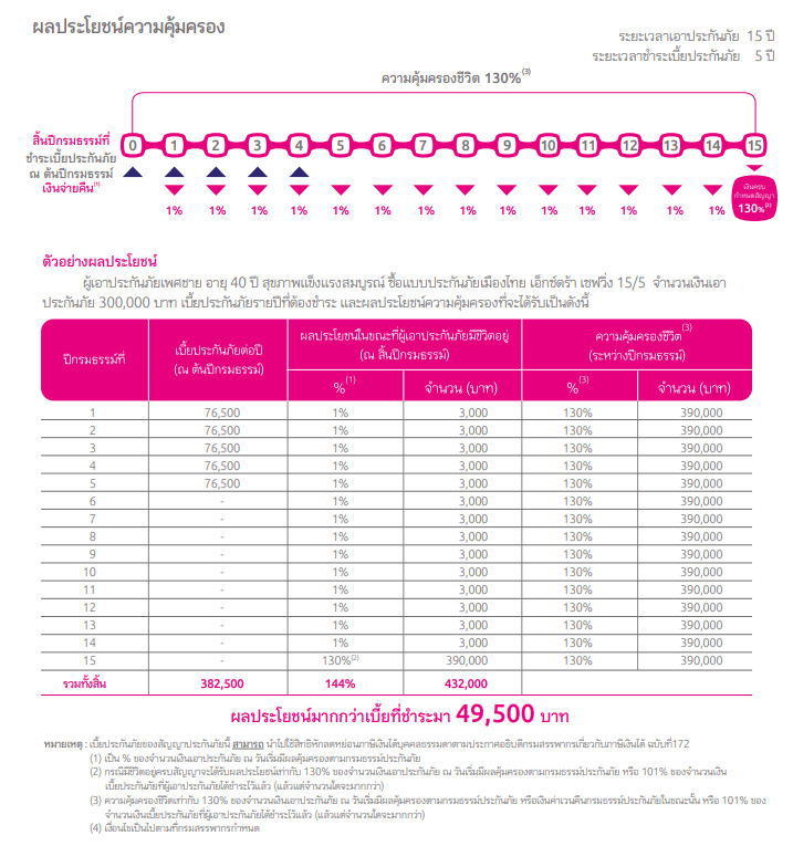 - มีเงินคืนทุกปีปี ตั้งแต่สิ้นปีกรมธรรม์ที่ 1 - 14 ปีละ 1 % ของจำนวนเงินเอาประกันภัย